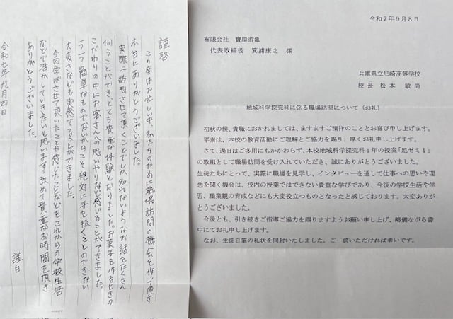 先日、兵庫県立尼崎高校の生徒さんが職場訪問にこられお礼のお手紙をいただきました。