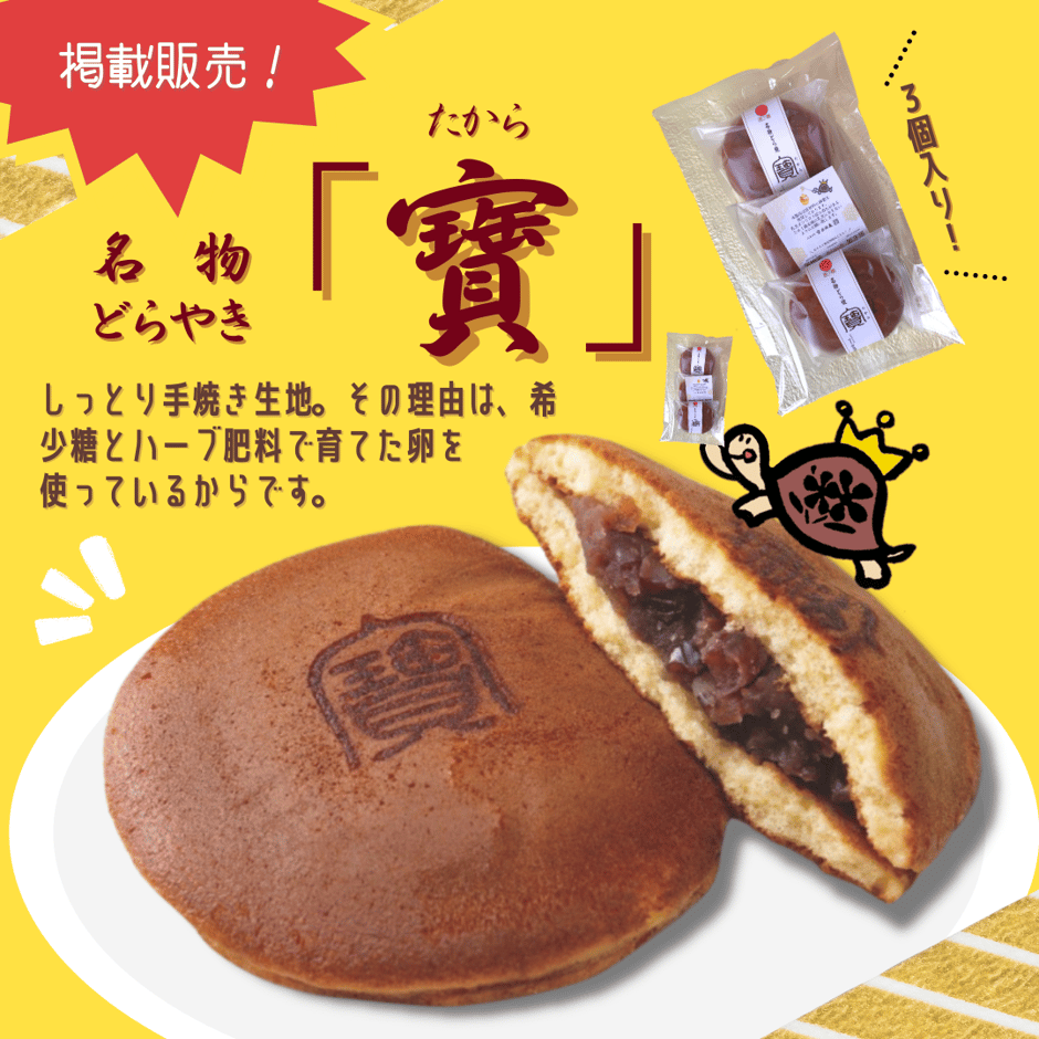 しっとり上品な甘みが感じられる名物どら焼き「寶」。